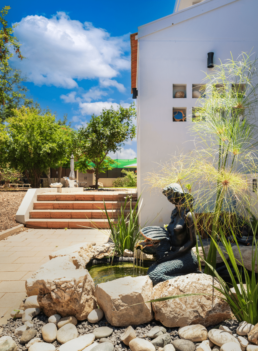 ובשביל הכניסה לבית מוקמה לה בת הים הקטנה מעל בריכת דגים.